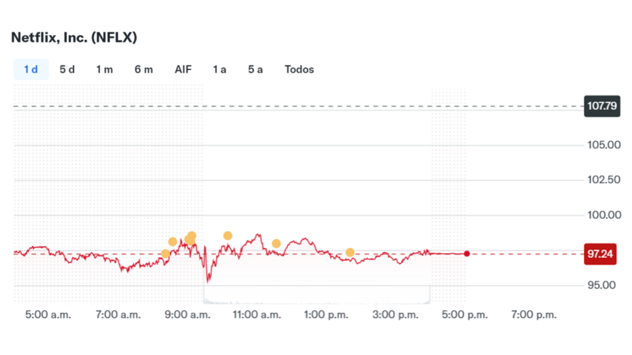 En medio de un día verde para casi todo Wall Street, Netflix (NFLX) se desplomó entre 8% y 12% —su mayor caída intradía desde abril de 2022— en lo que fue la historia corporativa más llamativa del día.