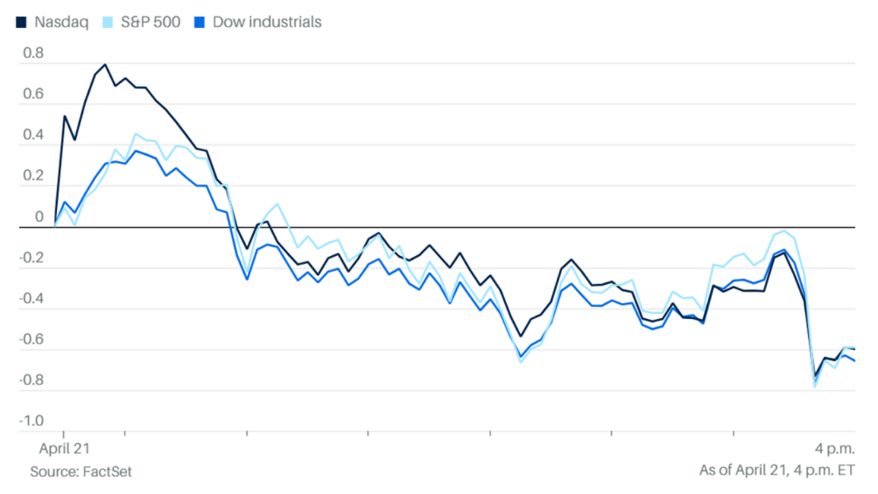 La jornada del martes 21 de abril comenzó con optimismo genuino. Los futuros apuntaban al alza, respaldados por resultados corporativos sólidos y el entusiasmo renovado por la inteligencia artificial (IA). Sin embargo, hacia el mediodía, ese impulso se evaporó cuando Pakistan confirmó que Irán aún no había dado respuesta formal a la invitación para las conversaciones de paz en Islamabad, y el presidente Trump declaró ante la CNBC que no tiene intención de extender el cese al fuego que vence este miércoles.