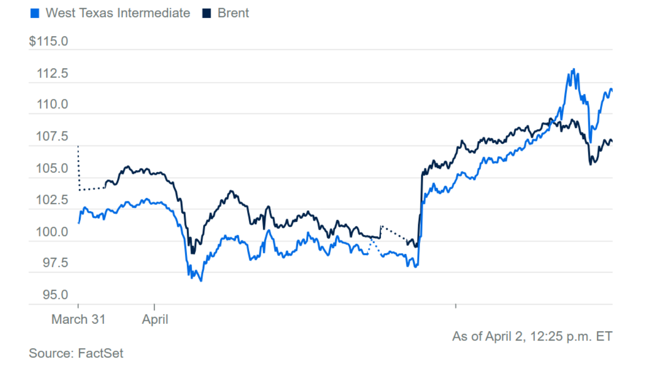 El crudo es el protagonista silencioso (y no tan silencioso) de todo esto. Desde que comenzó el conflicto hace poco más de un mes, el precio del WTI ha subido más de un 50% en términos mensuales. Hoy tocó $112 por barril, mientras el Brent llegó a $109.