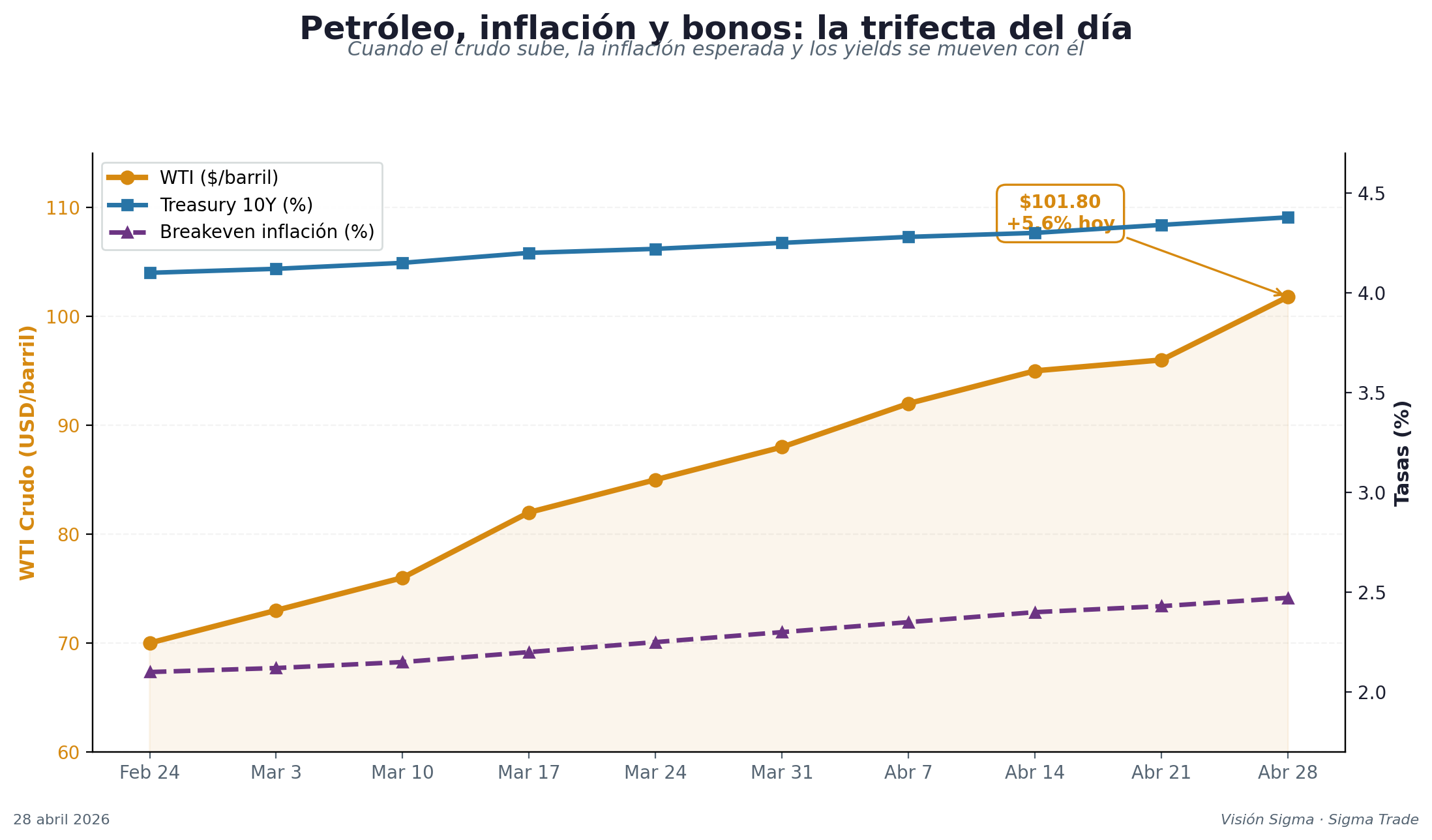 - 📈 WTI: +5.6% hasta US$101.80 (primera vez sobre $100 en tres semanas).