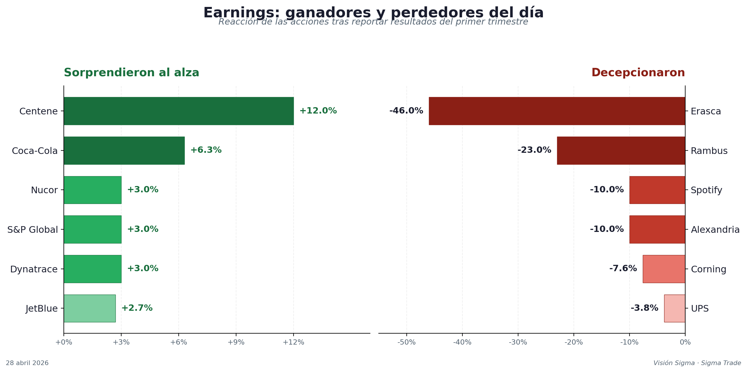 Highlights al alza: Coca-Cola (+6.3%, ingresos sobre consenso, fortaleza en China, EE.UU. e India), Centene (+12%, líder del S&P 500, guía anual elevada).