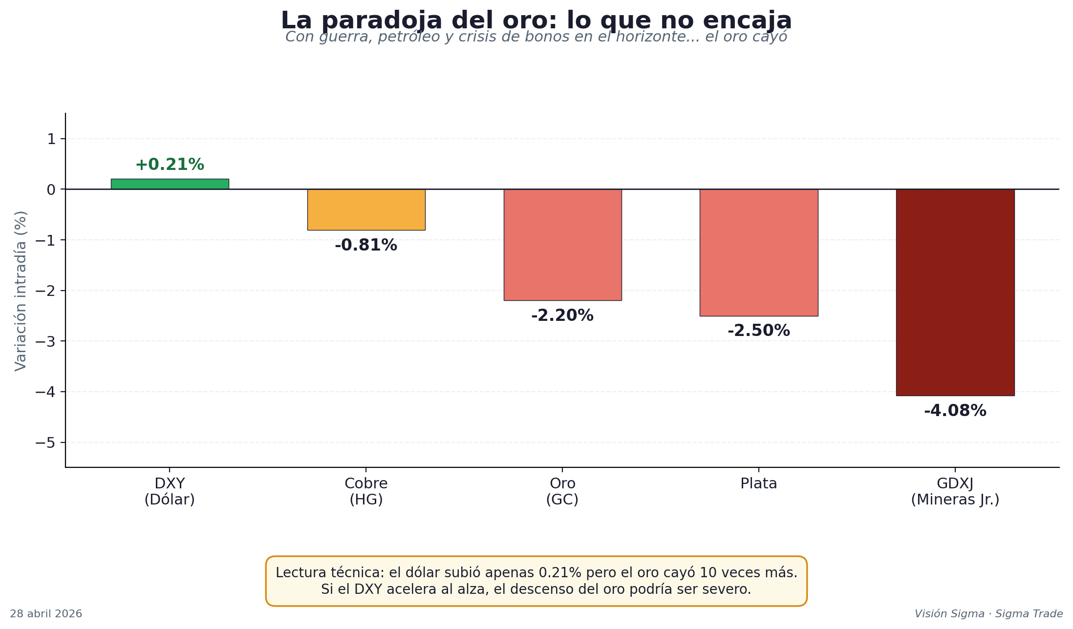 ⚠️ Lectura técnica clave: el dólar (DXY) apenas subió 0.21% hoy, pero el oro cayó 10 veces más. Esto sugiere que el mercado de metales preciosos tiene una debilidad estructural propia, y que si el dólar acelera al alza, el oro podría sufrir mucho más en las próximas semanas.